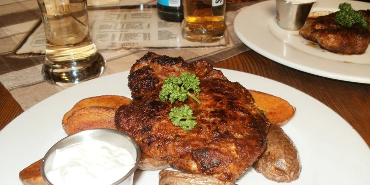 - 1× 300g grilovaný steak z krkovičky s přílohou a grilovací omáčkou