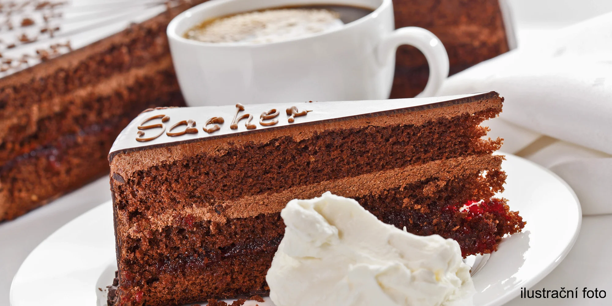 (espresso s mlékem, vídeňská káva, cappuccino) - 1× kousek čokoládového dortu sachr se šlehačkou a meruňkovou marmeládou