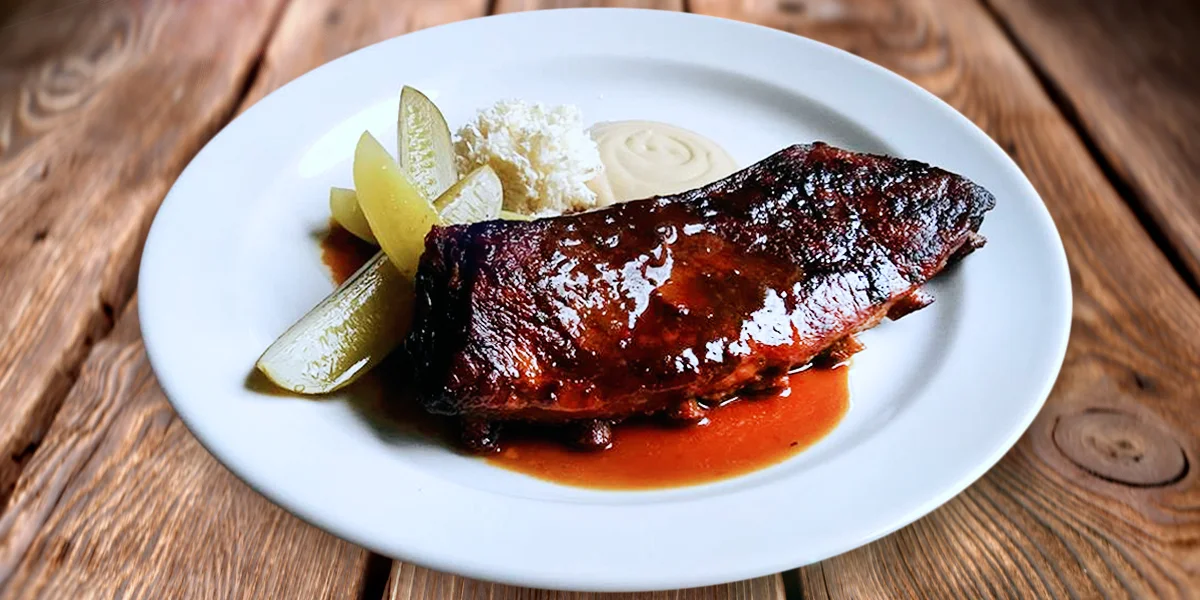 - 1× Marinovaná vepřová žebra pečená na pivě (500 g), pečivo, okurka, křen, hořčice