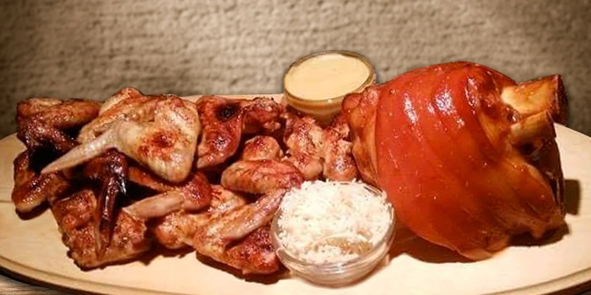 Vepřové koleno je pečené na pivě a podává se s řízným křenem a hořčicí, smočit v obojím můžete i marinovaná křidélka. Nestyďte se a chyťte je pěkně do rukou, ať od kosti dostanete všechno masíčko.