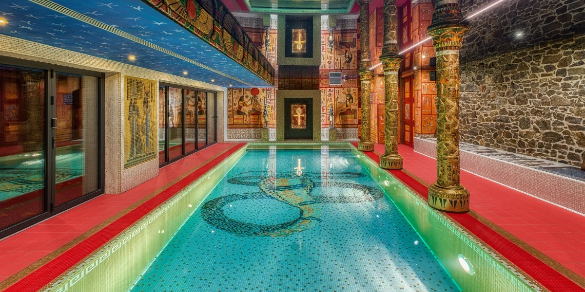 Plavání si můžete ztížit zapnutím protiproudu, případně se jen líně položit na lavici s perličkovou lázní či se nechat masírovat tryskami. Prostředí je jako vystřižené z dávných dob, sál je zdoben sloupy, hieroglyfy a motivy pyramid i egyptských krásek. Na dně 9,5 m dlouhého bazénu spočívá královská kobra, která vám symbolicky předá kus své síly.