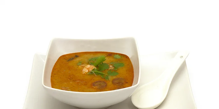 - 2× tom yum – pikantní polévka zjemněná kokosovým mlékem, skleněné nudle, cherry rajčátka, koriandr