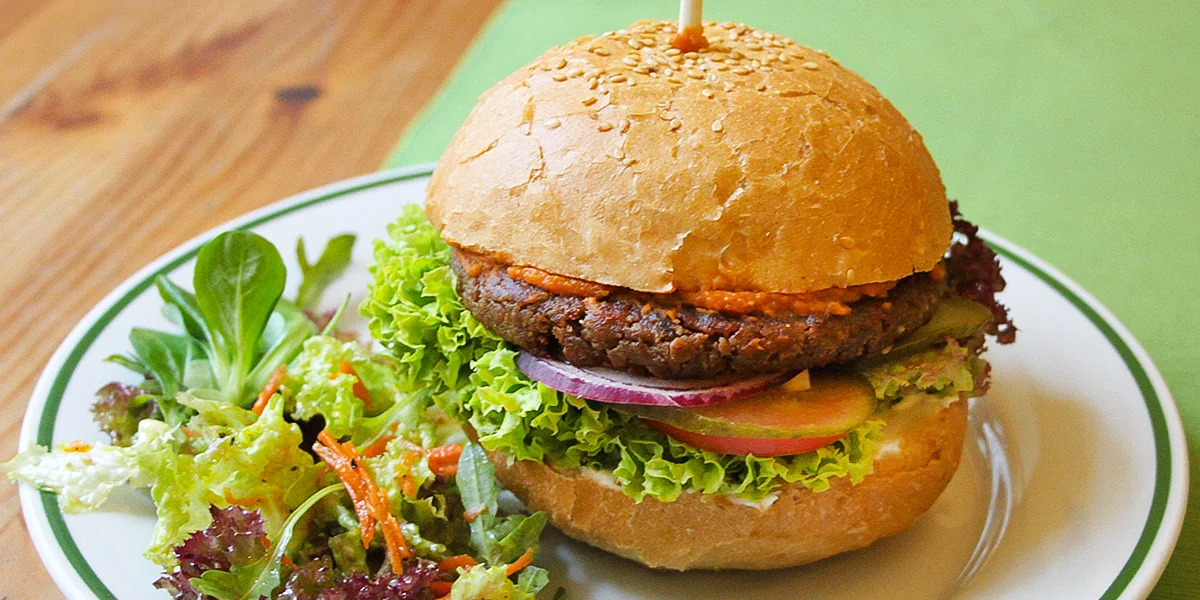 Přijít můžete klidně sami, ale pokud chcete radost z jídla sdílet s milovanou osobou, sáhněte po voucheru pro dva. Až se usadíte ke stolu, zvolíte si předkrm ze 2 variací: můžete si dát hummus, nebo cuketové pesto. A pak vám až pod nos naservírují domácí burger z tempehové směsi.