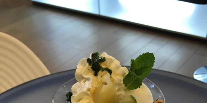 - Citronový sorbet: 2 kopečky citronové zmrzliny, vanilková, šlehačka, ořechy, poleva, oplatek