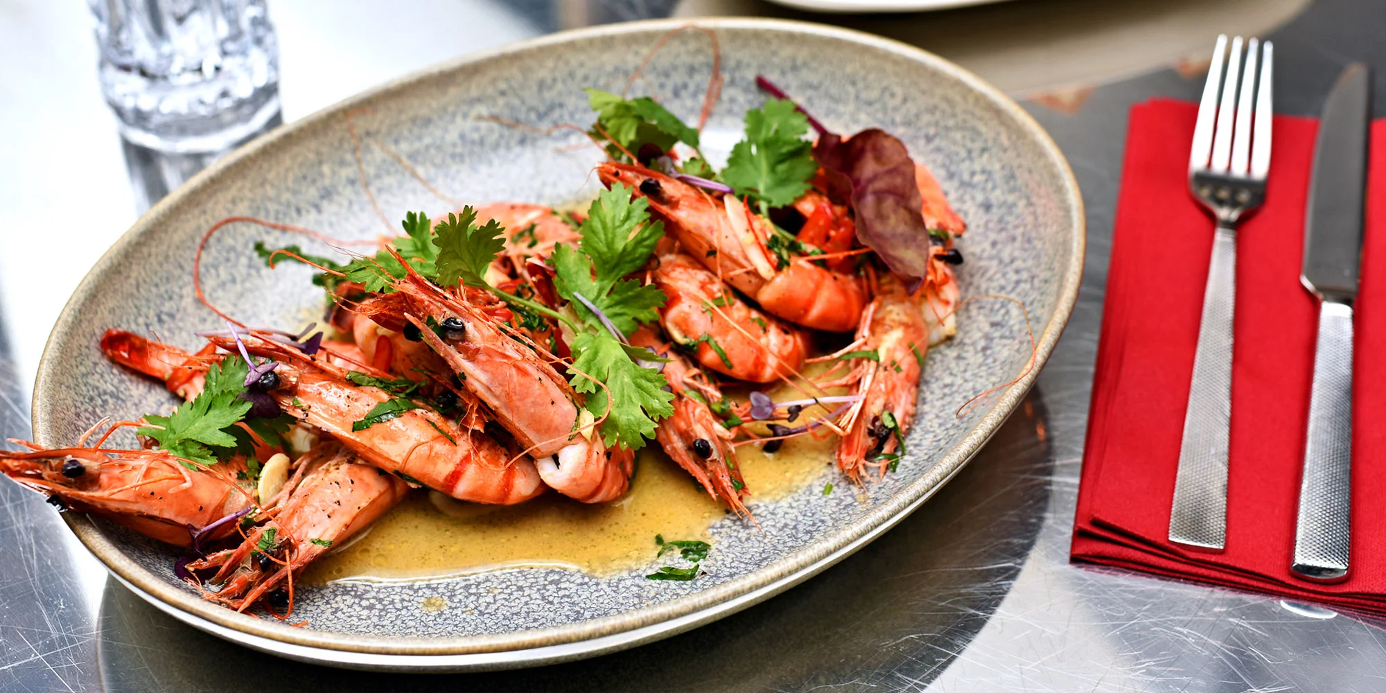 - Satuy´s restované tygří krevety s mangovou emulzí a pečivem