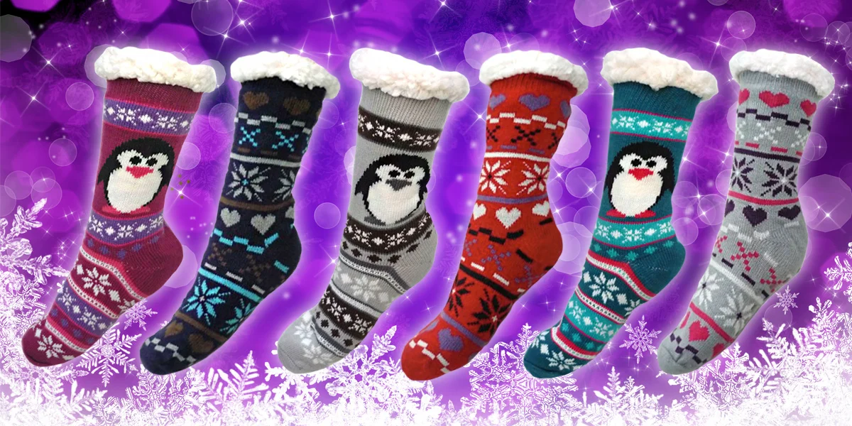 Hřejivé domácí ponožky s veselým obrázkem tučňáka a různými motivy