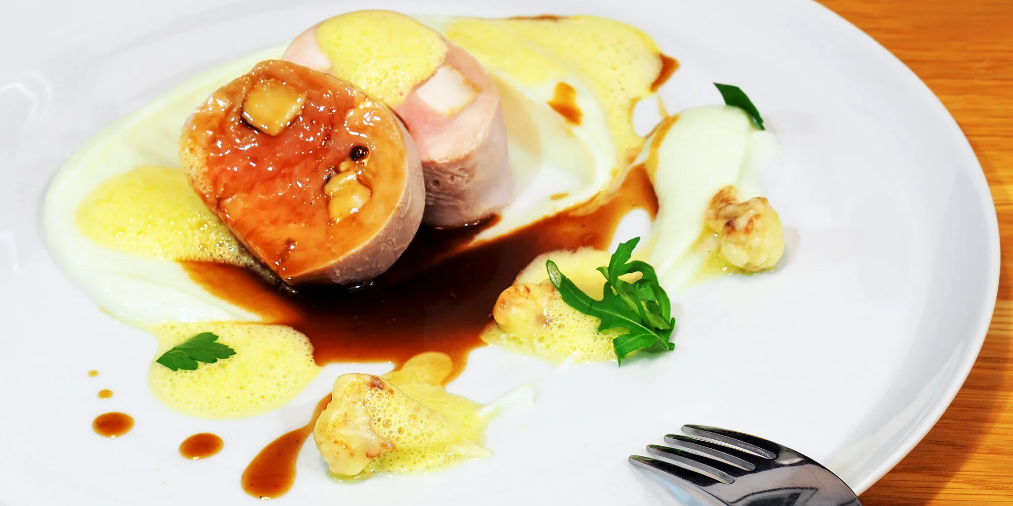 - 2× 180g kohoutí prsíčka sous-vide marinovaná v consommé, másle a tymiánu, s květákovým pyré a kdoulovou pěnou