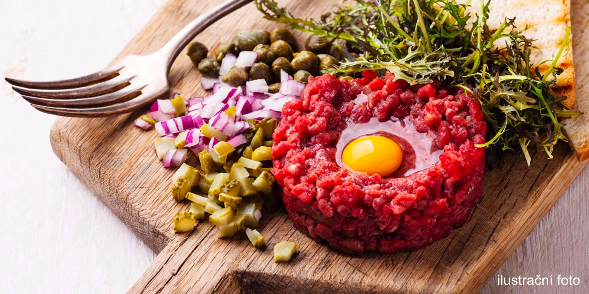 - 500 g mletého tataráku ze zadní hovězí kýty (míchaný nebo nenamíchaný)
