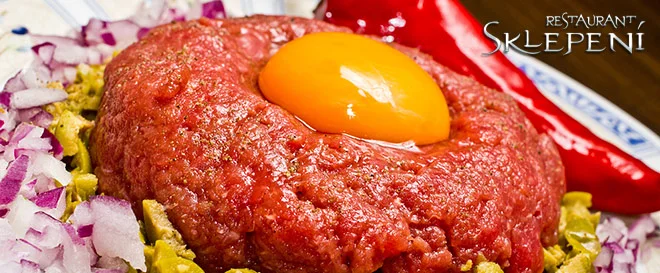 Zajděte s kamarády nebo drahou polovičkou do restaurace a pivnice Sklepení, kde na vás bude čekat výtečný 300gramový tataráček s desítkou topinek.