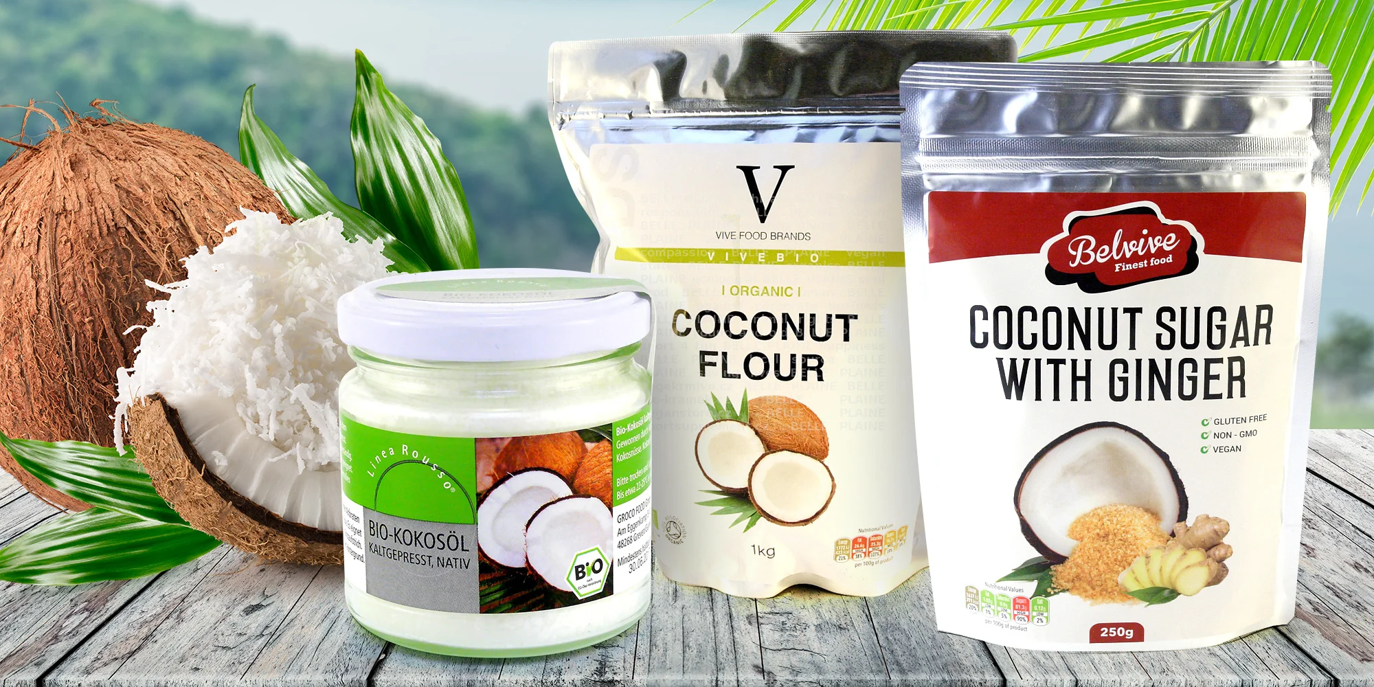 V rámci této nabídky si můžete vybrat různě velká balení kokosové mouky, kokosového cukru se zázvorem – který je zdravější alternativou bílého rafinovaného cukru – a extra panenského bio oleje.