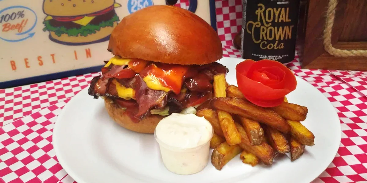- double bacon burger (260 g hovězího masa), cibulová marmeláda, salát, rajče, slanina, cheddar, brioška, BBQ omáčka, Bagel´s dresink