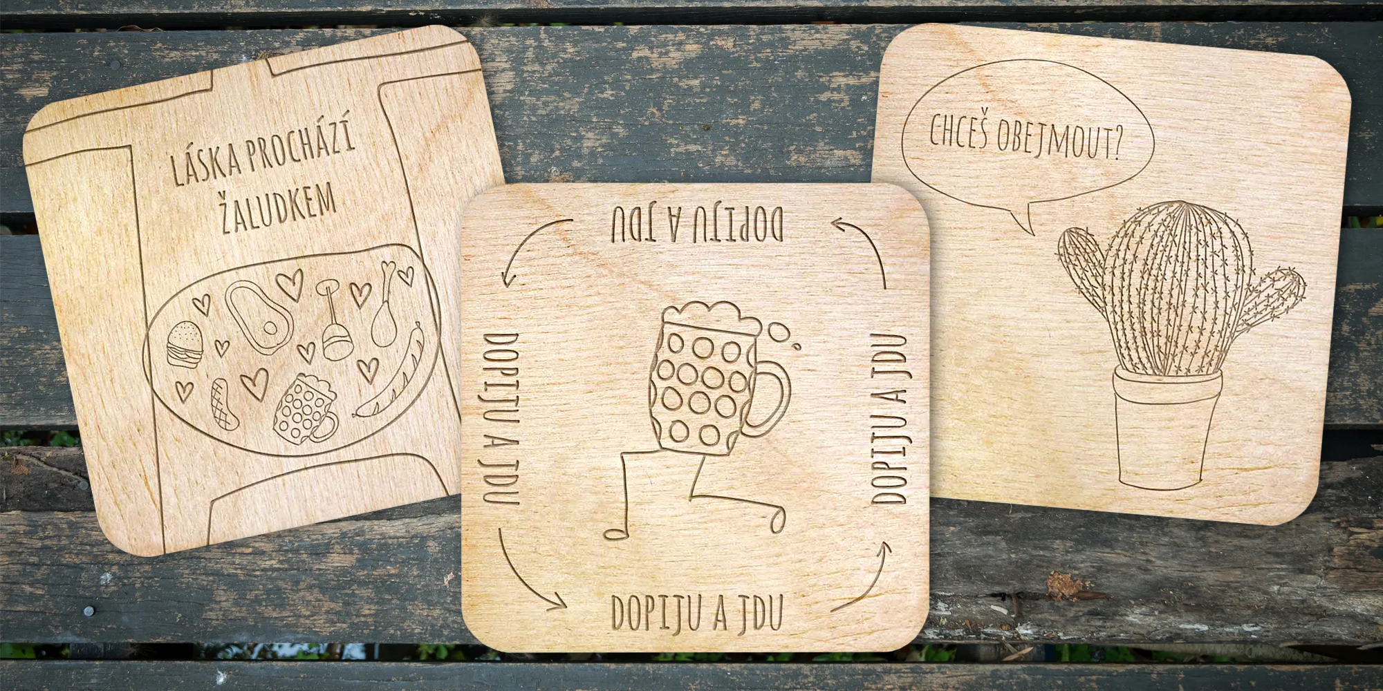 Vybavte svou domácnost praktickými a zároveň krásnými a vtipnými podtácky. Váš nábytek tak bude ušetřen nechtěných památek na to, kam si kdo postavil svoje pití. Na výběr máte pět různých sad podtácků vždy po čtyřech kusech. Podtácky jsou z broušené bukové překližky a mají rozměry 9 × 9 cm.