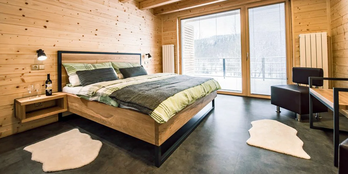 Celý areál se skládá ze dvou luxusních dřevěných chalup pro 16 a 24 osob. Vyspíte se proto v pokojích vonících dřevem, ze kterých je hezký výhled na okolní hory. Všechny pokoje mají balkon nebo terasu a jsou vybavené prostornou koupelnou s podlahovým vytápěním. V obou chalupách jsou rekuperační jednotky zajišťující příjemné vnitřní prostředí. V zimních termínech se ubytujete v chalupě pro 16 a v jarních máte na výběr z obou.