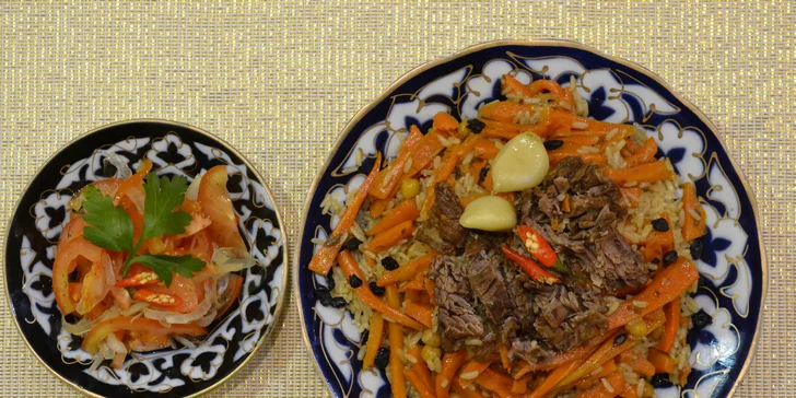 Tence nakrájený salát achuchuk, který je pro Uzbekistán typický, je především směsí cibule a rajčat, a skvěle tak plov doplňuje. Vy si tuhle parádu vychutnáte sami nebo ve dvou. Na čepu si navíc můžete objednat pivo, kterým vše hezky zapijete.