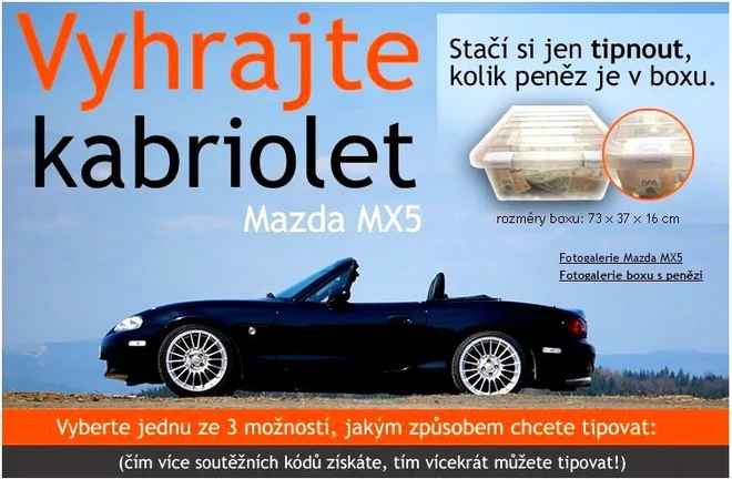Na stránkách e‑shopu se nyní můžete zapojit do soutěže o nadupaný kabriolet Mazda MX5. Stačí uhodnout, kolik peněz je uložených v průhledném plastovém boxu. Podívejte se na podrobnosti a přečtěte si pravidla soutěže.