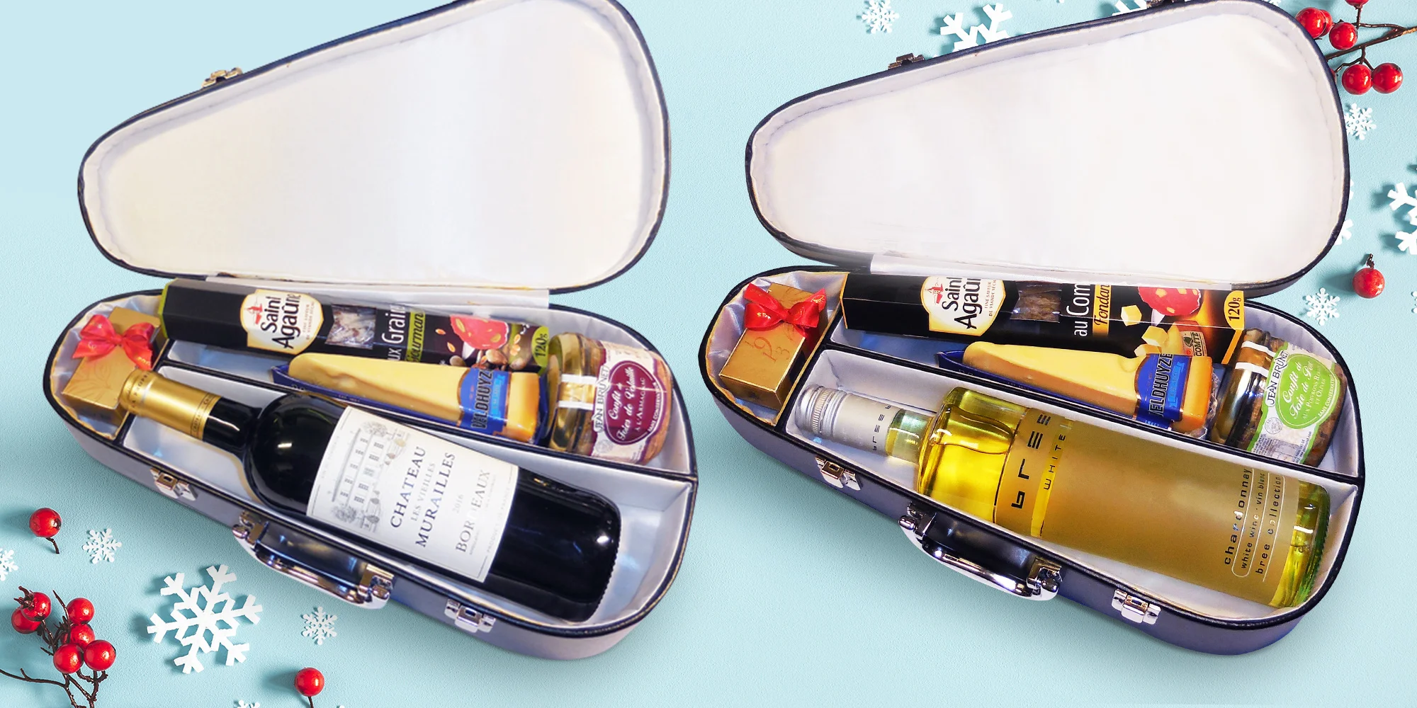 Houslové pouzdro je originální a vtipný dárkový balíček, který se hodí nejen pro houslisty a houslistky. Najdete v něm sušenou španělskou panenku, paštiku, sýr Blue label a francouzské červené víno nebo bílé víno.