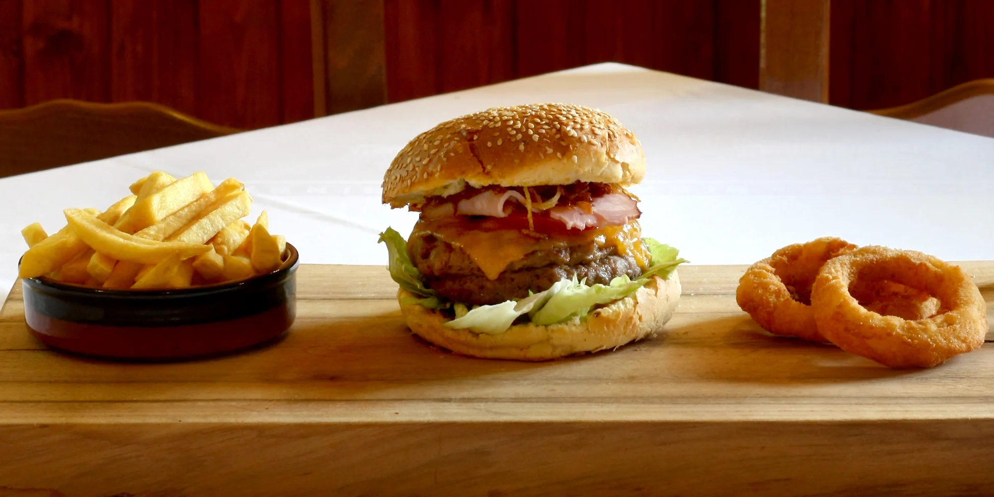 - 2× burger (180 g hovězího masa, slanina, čedar, BBQ omáčka, zelenina)