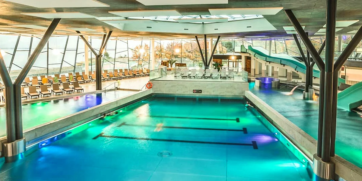 - 4 vnitřní bazény: relaxační, masážní, vlnový a dětský