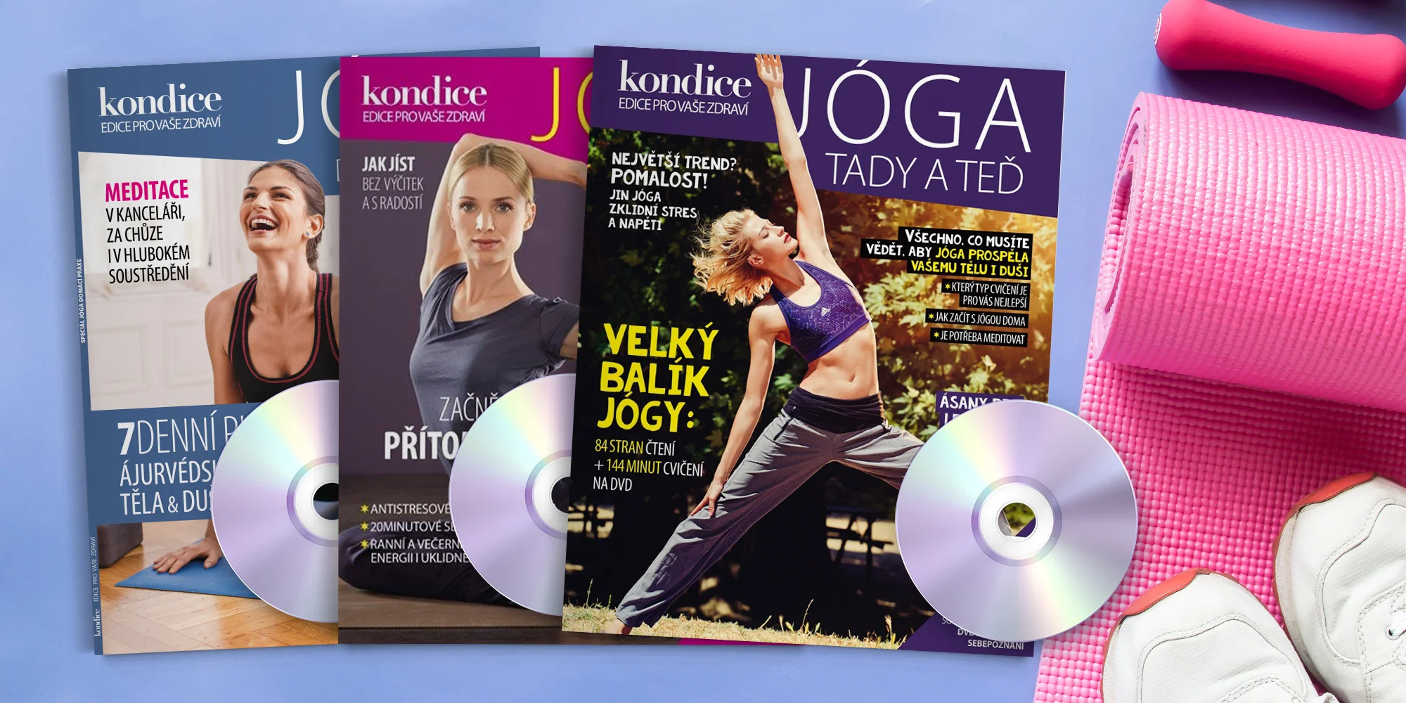 Udržujte se ve formě a začtěte se do časopisu Kondice. Až do schránky vám přijdou 3 nejpopulárnější jógové speciály včetně DVD se cvičením i praktickými radami lektorky Zuzky Klingrové. Stačí rozložit jógamatku a zklidnit mysl. Jako dárek navíc dostanete speciál plný zdravých a rychlých receptů. Takže po cvičení se můžete přesunout do kuchyně a dodat si energii i dobrým jídlem.