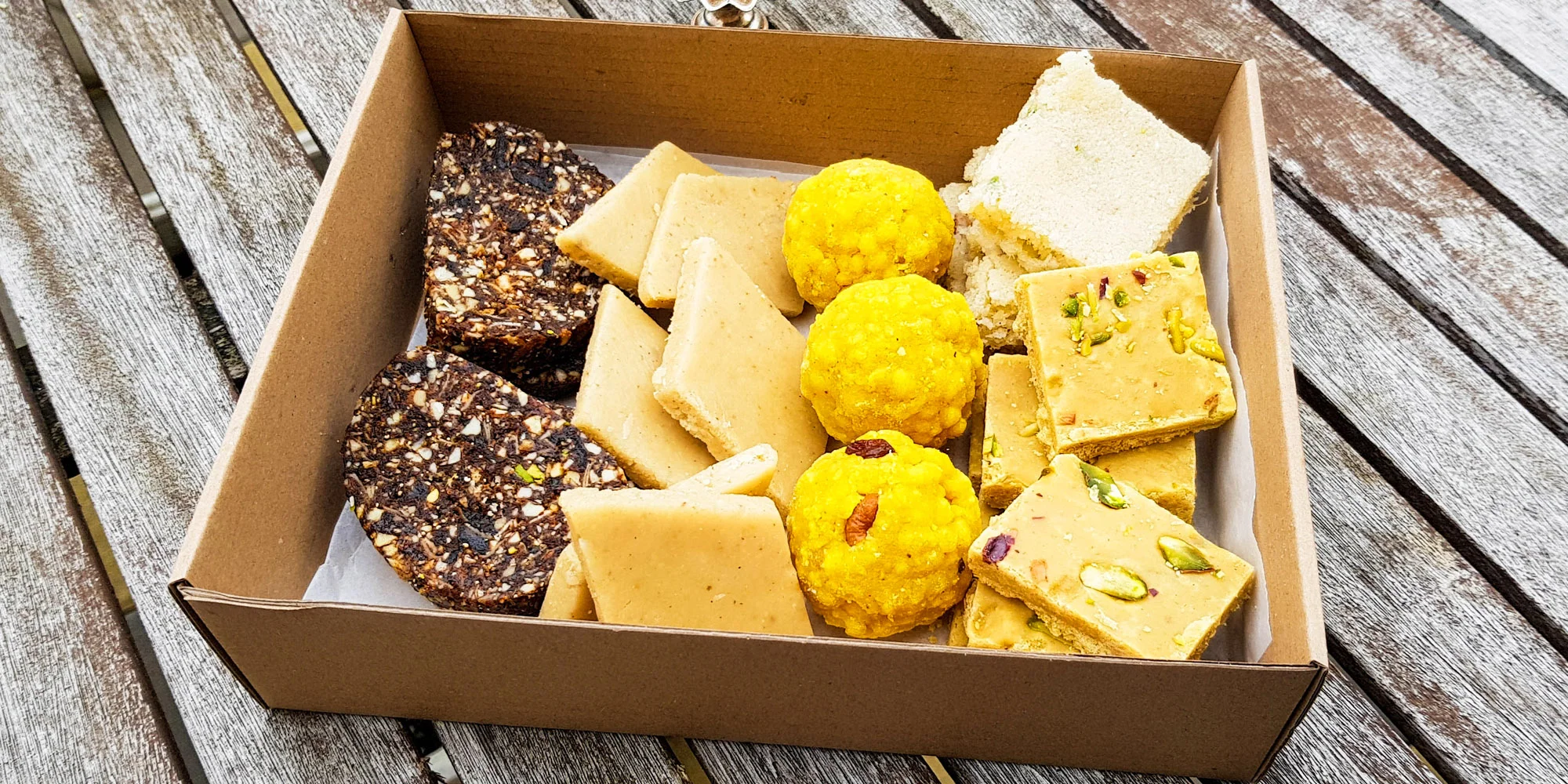 V nabídce najdete variantu s 250, 500 nebo 1000 g cukroví, které obsahuje třeba burákovo-šafránové nebo kokosové burfi, boondi ladoo, kaju katli a jiné.