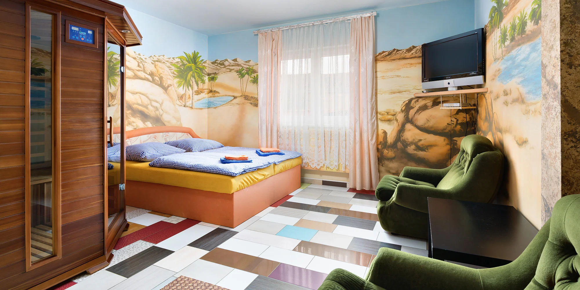 To první, co vás při vstupu do pokoje zaujme, bude jistě originální výzdoba. Oči se vám pak jistě stočí i k pohodlné posteli a zřejmě i k televizi, pak už je ale určitě budete valit na něco, co jen tak ledajaký pokoj nemá – vlastní saunu. V té si jednou za pobyt užijete 50 minut nerušeného relaxu, kvůli kterému nemusíte udělat prakticky ani krok.