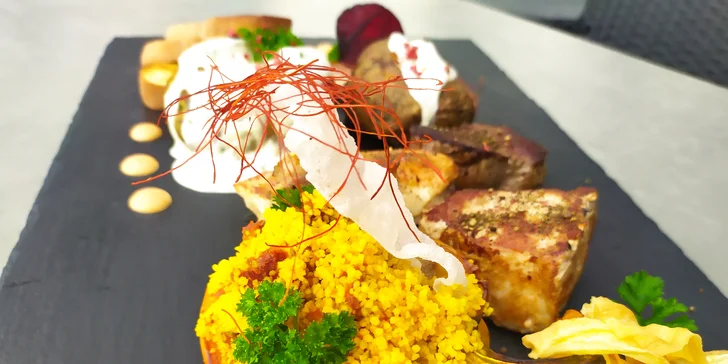 Ve skvěle hodnoceném HIT restaurantu vám naservírují variaci grilovaných mas (kuřecí supreme, hovězí rumpsteak, vepřová pečeně) s pečenou bramborou, paprikou plněnou kuskusovým salátkem i omáčkou a pečivem. Pochutnáte si rovnou ve dvou osobách. Na čepu je Staropramen, rádi vám tu udělají ale třeba i domácí ledový čaj nebo limonádu.