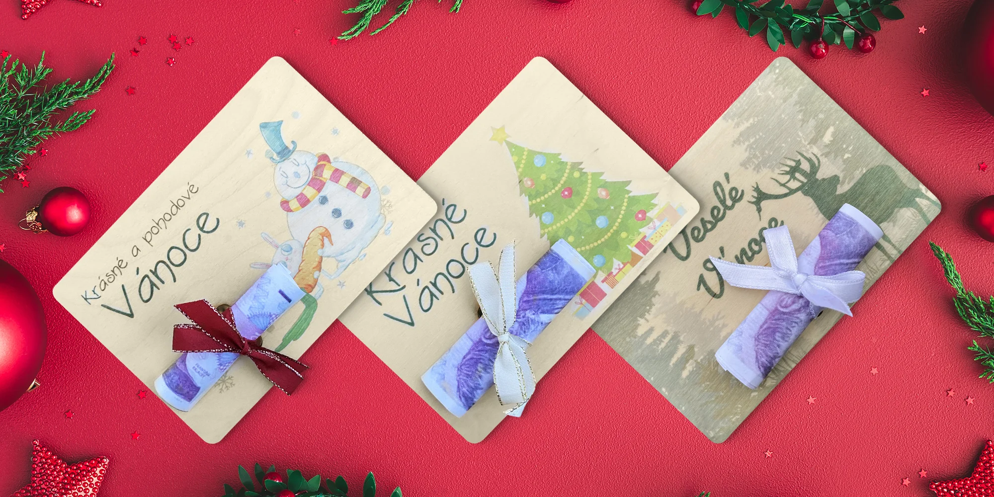 Nevíte, co komu dát pod stromeček? Nebo si myslíte, že by si obdarovaný sám vybral lépe? Nelamte si hlavu! Bankovky pod stromečkem potěší vždy každého. Vy je navíc věnujete stylově – na dřevěné destičce s mašlí. Na výběr je 23 barevných i bezbarvých motivů: od sněhuláka, tučňáka až po stromeček či pana perníčka. Na každou z destiček navíc můžete nechat napsat vlastní text, jméno či věnování – na výběr je více jak 60 fontů písma.