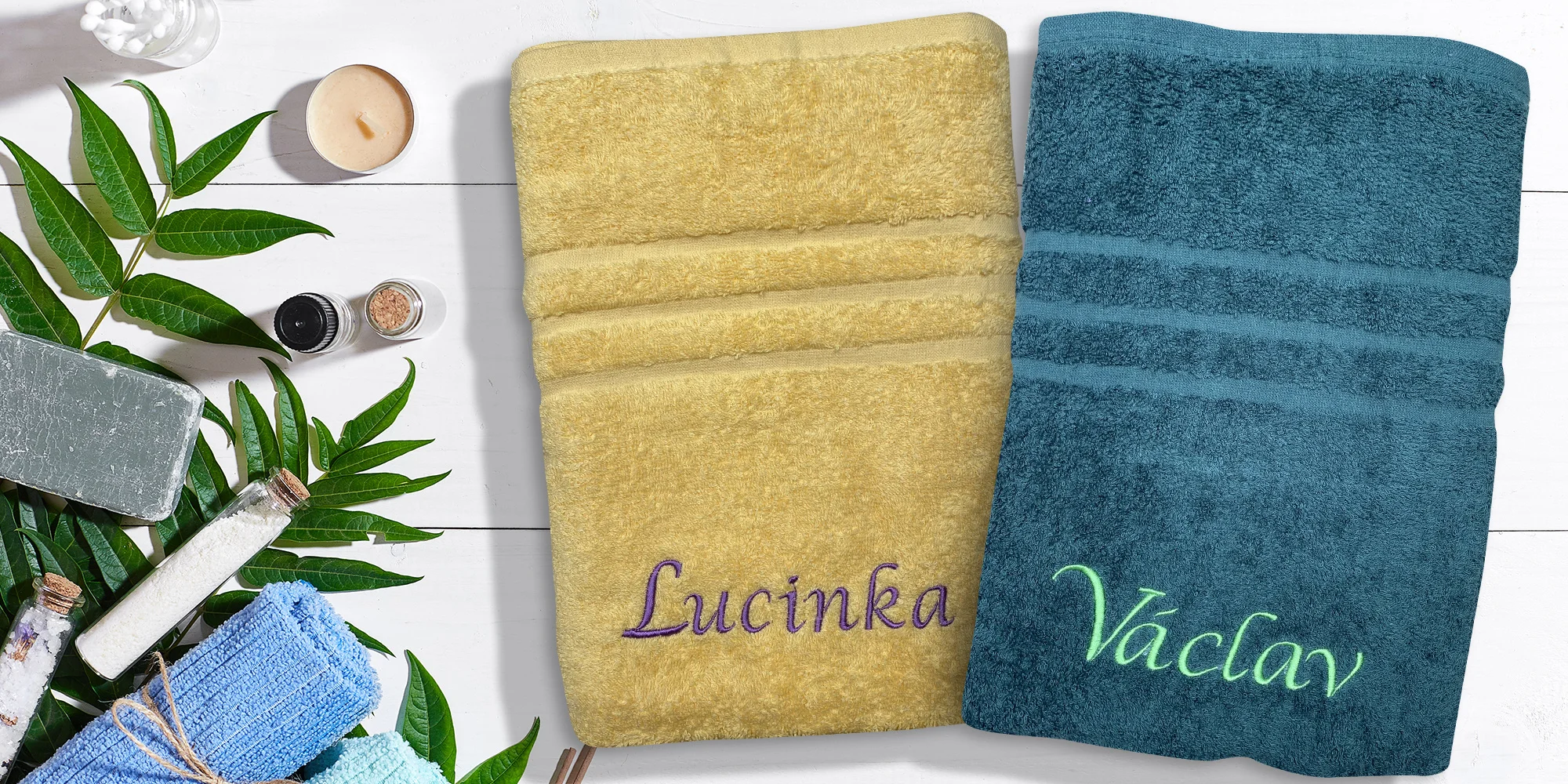 Kromě toho si můžete vybrat celkem z 10 barev ručníků a 8 barev osušek a 16 barev nití a uzpůsobit tak konkrétní výrobek přáním toho, pro koho je ručník či osuška určený. Vše si snadno navolíte přímo během objednávky.