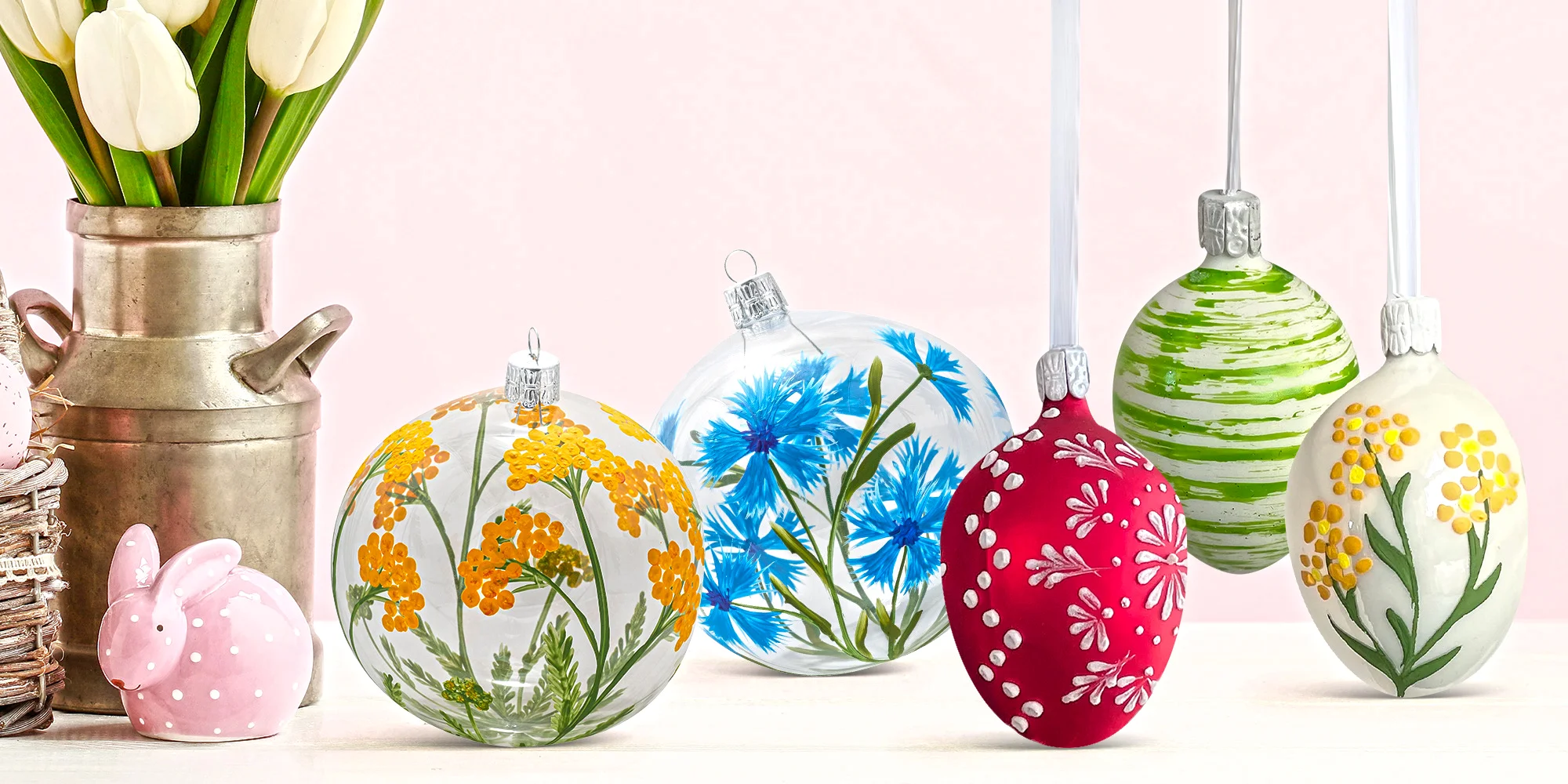 Přivítejte jaro a oslavte Velikonoce s unikátními skleněnými ozdobami. Ručně je vyrábí z foukaného skla v nové sklárně Oflendě v Pardubickém kraji. Z kolekce ozdob můžete sáhnout po klasickém tvaru koule nebo po verzi kraslice. Ozdoby jsou ručně malované a zdobí je např. luční kvítí, puntík nebo třeba mašlička.
