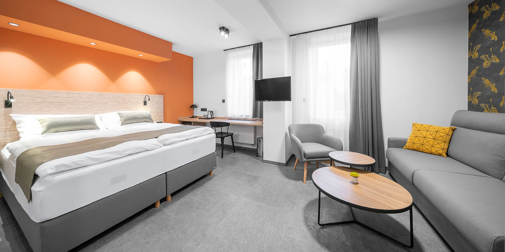 K parádnímu pobytu můžete volit ze tří typů moderních pokojů: Standard, Komfort a Superior. Všechny pokoj jsou vybavené pohodlnými postelemi s certifikovanými bambusovými matracemi (180 × 200 cm nebo oddělená jednolůžka) a antialergenními polštáři a přikrývkami. Samozřejmostí je moderní koupelna se sprchou a toaletou, LCD TV a Wi‑Fi. Potěší vás i lednička a závěsy blackout. Komfort má přepážkou oddělenou ložnici a obýváček s gaučem. Superior navíc ještě nadchne nejmodernější koupelnou a klimatizací, v obýváku má velký rozkládací gauč (možnost přistýlky).