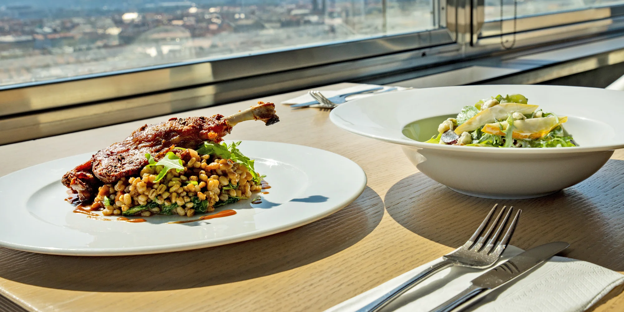 Udělejte z oběda nevšední zážitek a zajděte se najíst do Bistra 66 v Žižkovské věži. Ve výšce 66 metrů nad zemí se nejen pokocháte krásným výhledem, ale ještě si pochutnáte na konfitovaném kachním stehnu s kroupovým rizotem a na salátu s gorgonzolou, ovocem a ořechy.