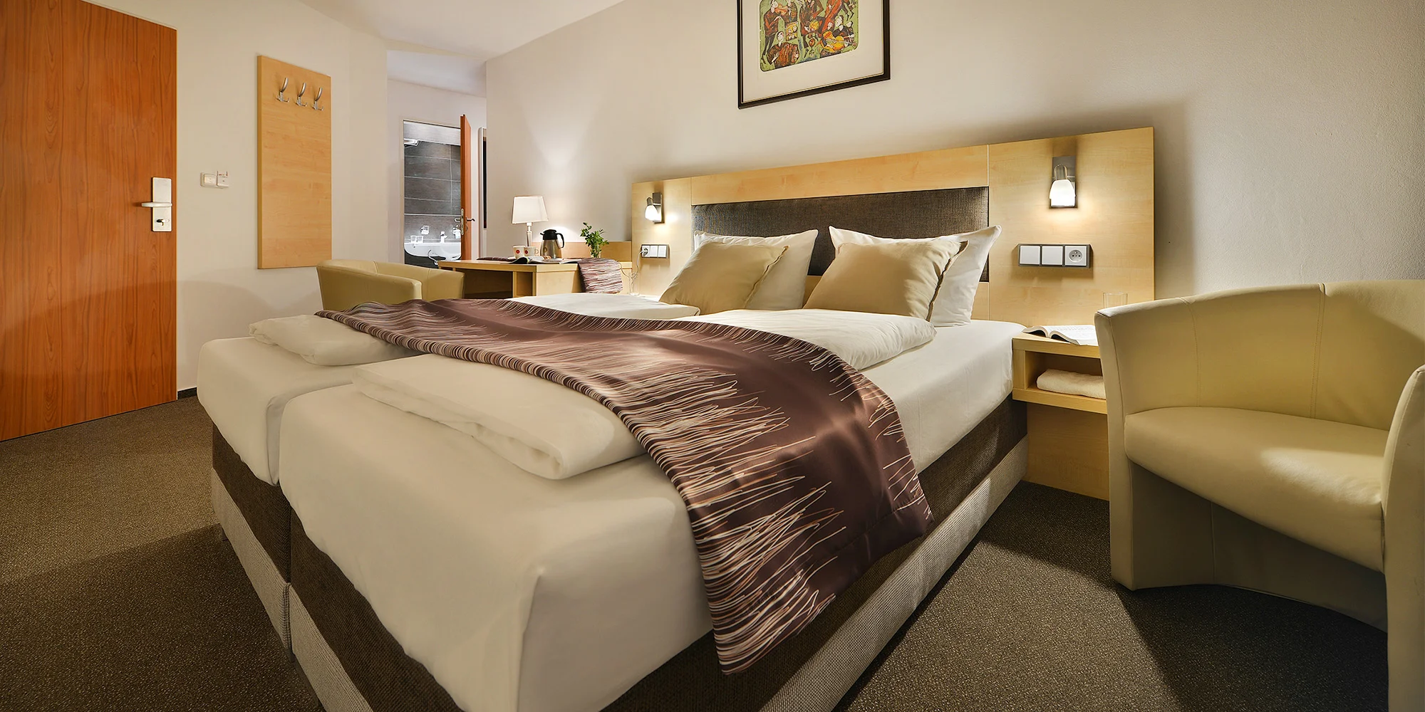 V nabídce hotelu jsou pokoje pro 2, 3 i 4 nocležníky. Všechny pokoje jsou stylově a moderně zařízené – čekat na vás budou pohodlné postele, koupelna se sprchou a toaletou, úložné prostory a set na přípravu kávy a čaje. Samozřejmostí je televize a připojení na Wi‑Fi. Pokud přijedete autem, za příplatek je možné zajistit garážové stání (nutná rezervace předem). Zajištěné budete mít i snídaně, které se podávají formou bohatého bufetu v čase 7:30–10:00. Těšte se také na láhev sektu na pokoji.
