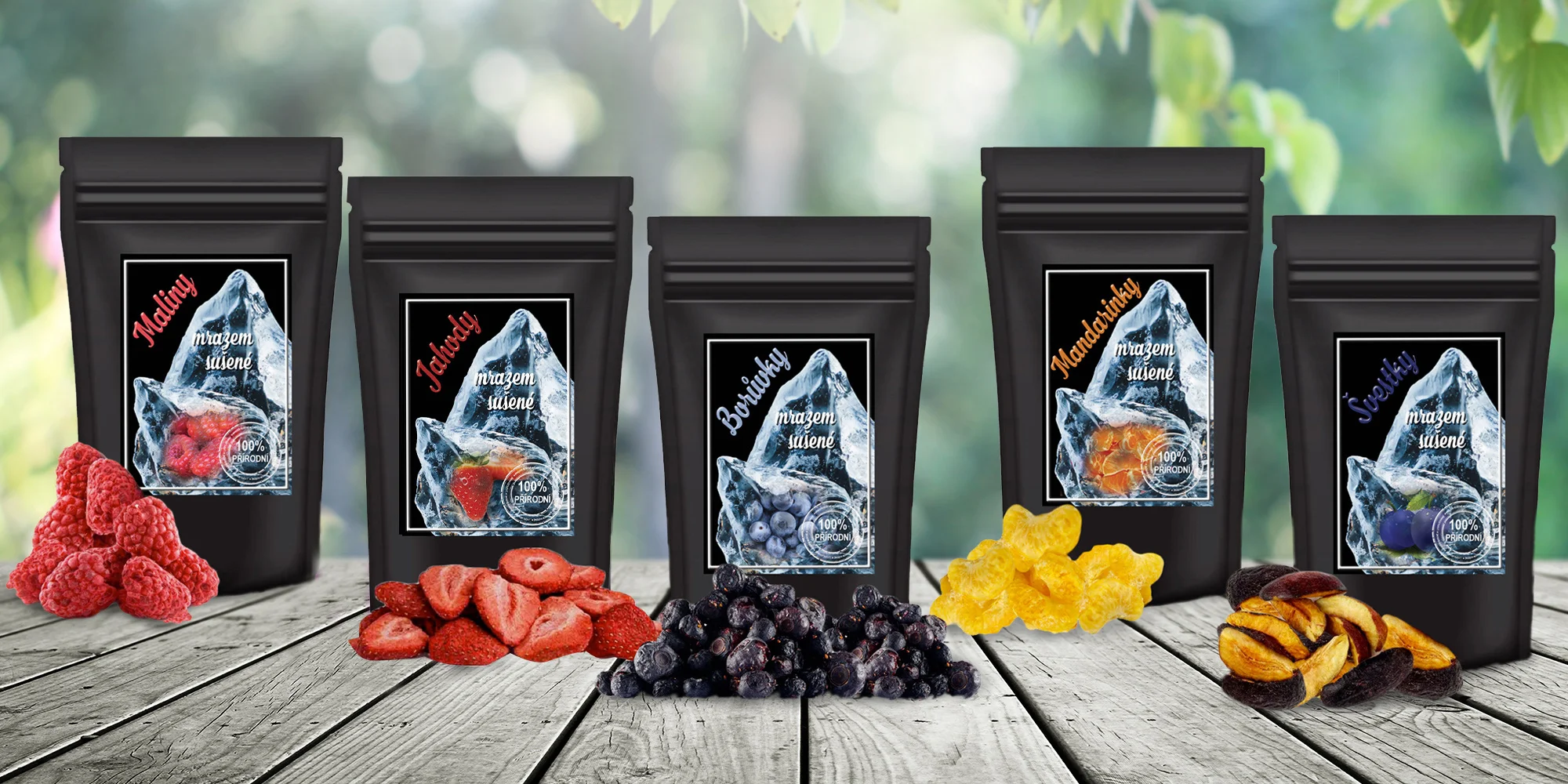 Lyofilizované ovoce je sušeno bez použití konzervantů, jedná se o čistě přírodní produkt. Zachovává si tvar, barvu i strukturu čerstvého ovoce a chutná prostě špičkově. V nabídce je 9 druhů, kromě klasiky, jako jsou jahody či višně, vyzkoušejte např. mango, švestky nebo mandarinky.