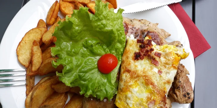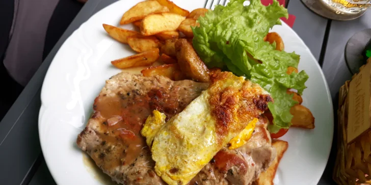 - 2× vepřový steak Hollywood se šunkou, žampiony a vejcem (à 300 g)