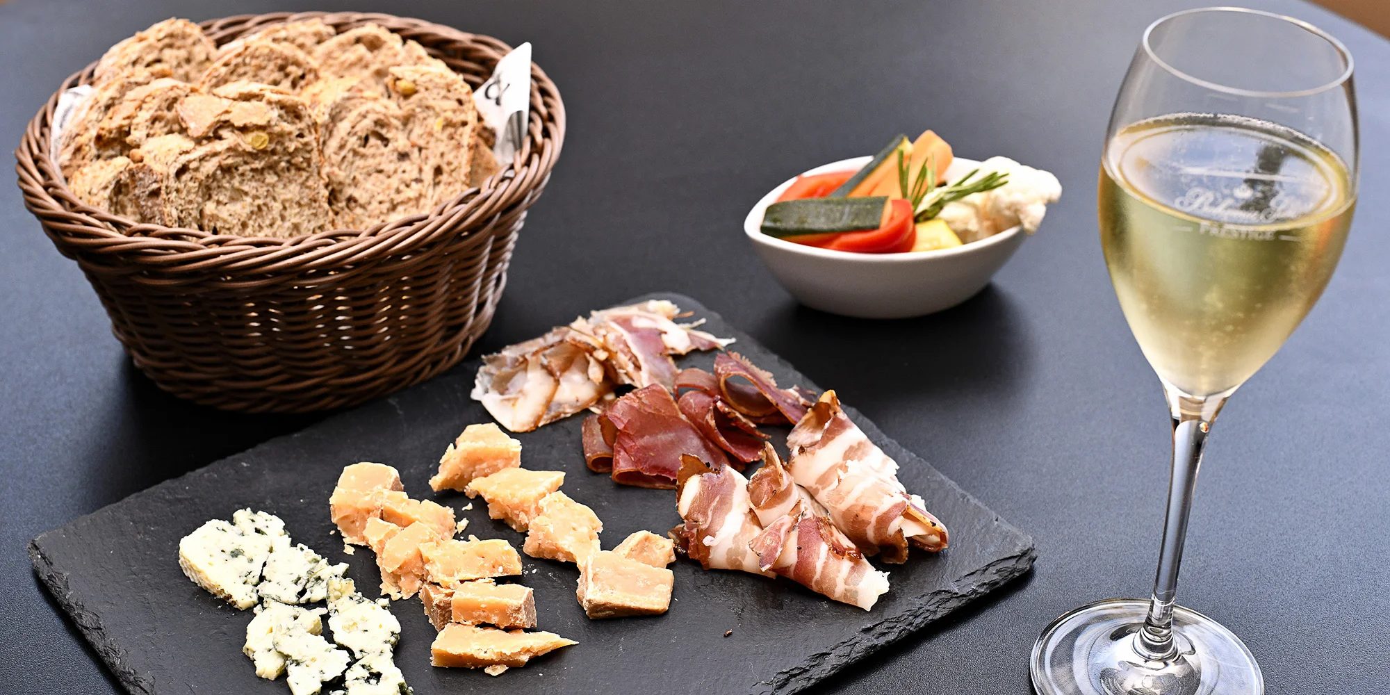 K sektu vám sommeliéři naservírují degustační prkénko se sýry a uzeninami, k bílému vínu si pochutnáte na kravském sýru grana padano a fermentované zelenině, k červenému se bude podávat paštika. Nebude chybět křupavý rozpečený chléb. Všechny zmíněné delikatesy pochází výhradně od regionálních dodavatelů. Sýry pochází z farmy Oldříš, uzeniny z české Pršuterie Chovaneček a paštiky od firmy Melememaso. Vína jsou samozřejmě od českých a moravských vinařů.
