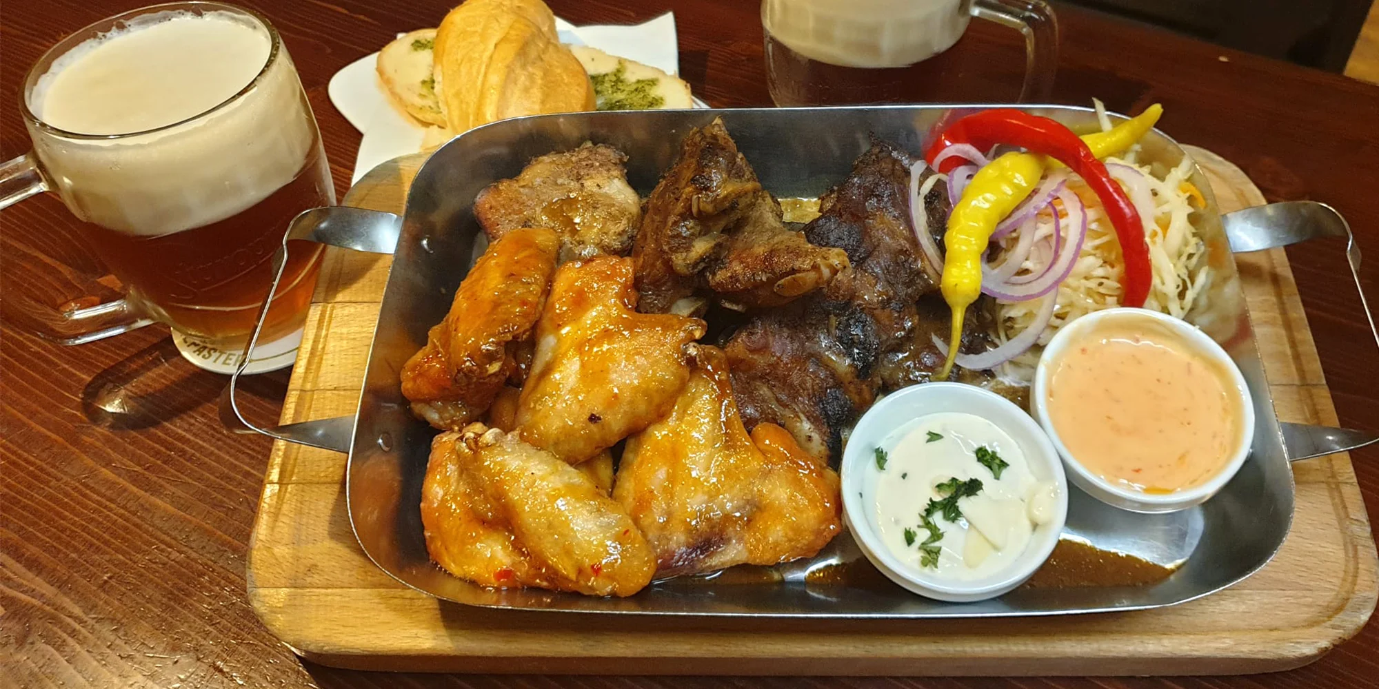 Tuhle nadpozemskou dobrotu vám naservírují ve Smíchovském radničním sklípku. Na pekáčku vám na stůl přistane celkem 800 g dobrot v čele s pikantními marinovanými křídly, vepřovými žebírky, zeleninou a omáčkami. K tomu si vychutnáte rozpečenou česnekovou bagetu. Na výběr je i varianta se dvěma pivy dle výběru z nápojového lístku.