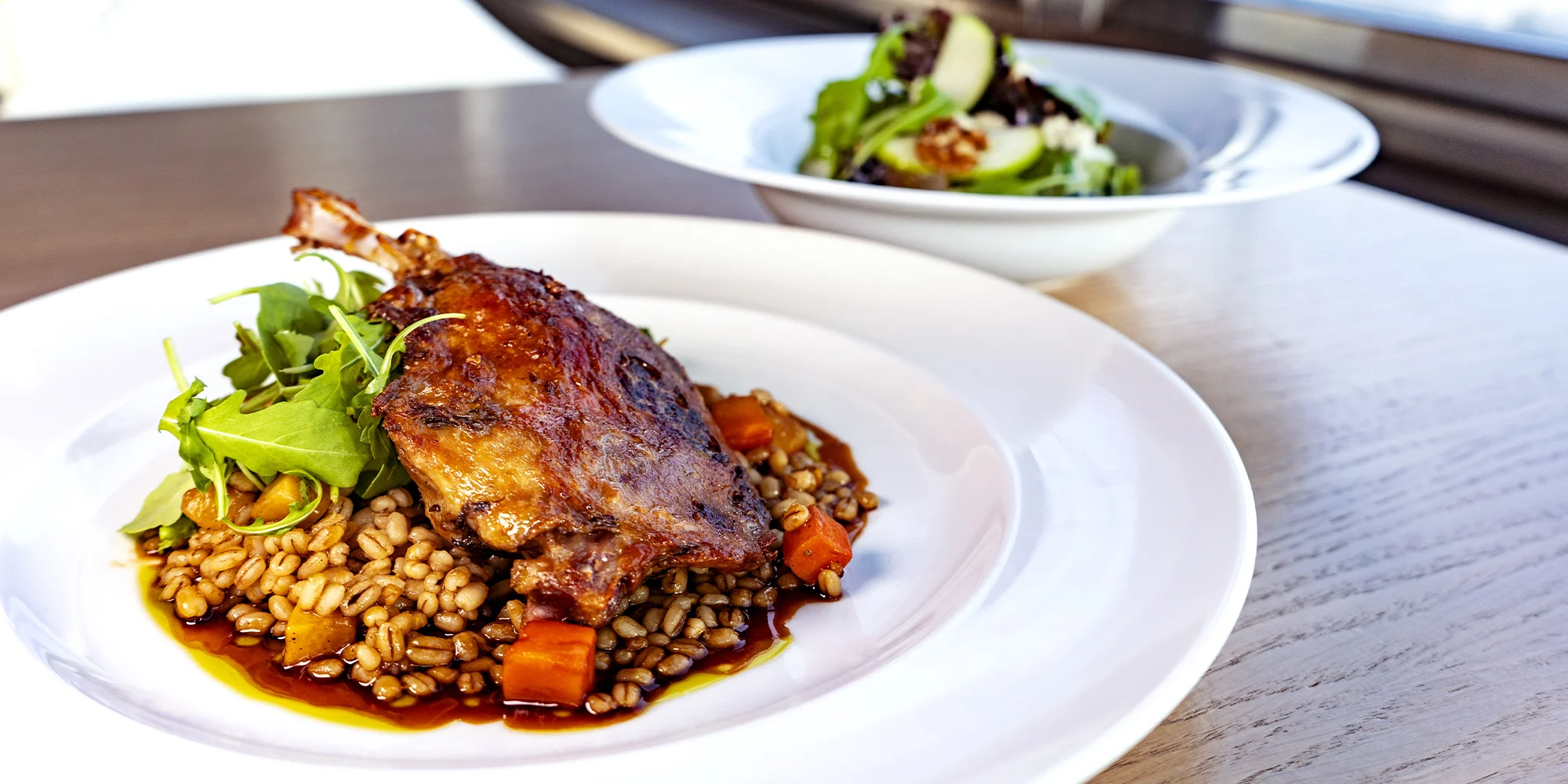 - Konfitované kachní stehno, kroupové rizoto, pečená kořenová zelenina a silná redukce se skořicí