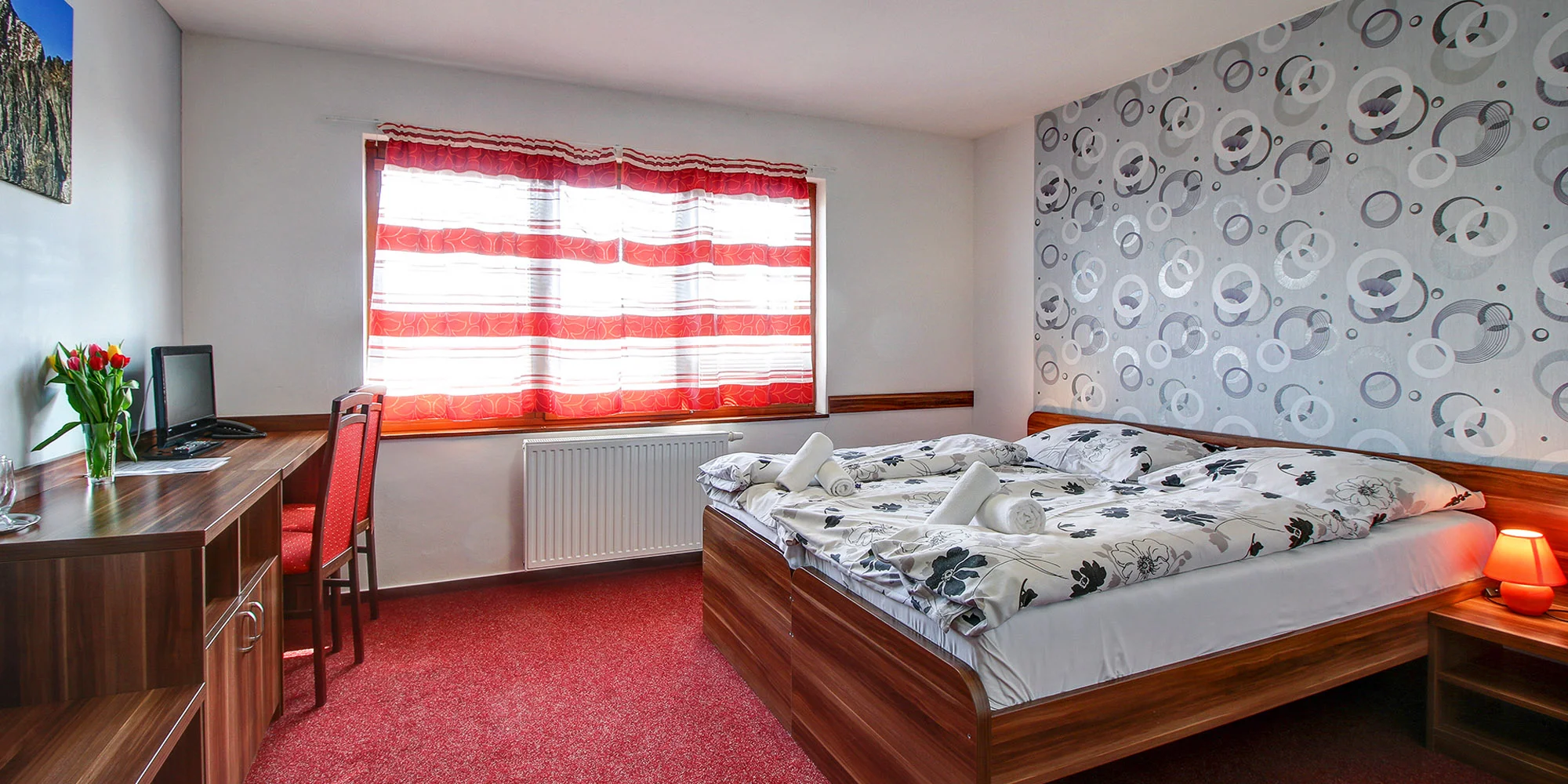 Ubytovaní budete v pokoji Double nebo v pokoji Lux. V případě zájmu lze do pokoje Double umístit jednu přistýlku a do pokoje Lux rovnou dvě. Všechny pokoje mají vlastní koupelnu, WC, LCD televizor, Wi‑Fi a rádio. Dvoulůžkové pokoje Lux mají navíc ledničku a spolu s jednolůžkovými pokoji disponují i prostorným jižně orientovaným balkonem s širokým výhledem na hřeben Nízkých Tater.