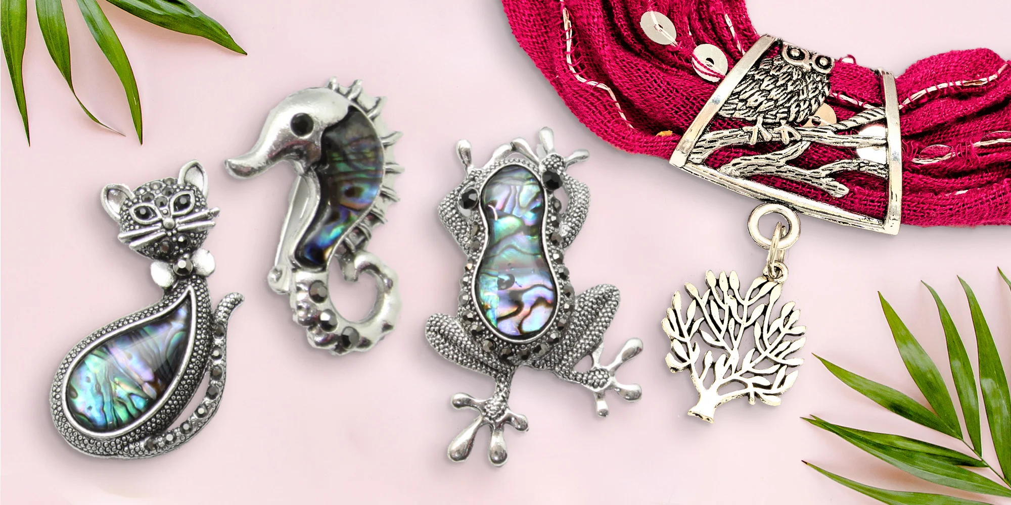 Pořiďte si krásné doplňky, které vám neuletí! Brože z kovu zdobené perletí můžete mít v různých tvarech – je libo pávy, motýly, želvy, kobry nebo krásné mořské koníky? Stačí je snadno připnout zavíracím špendlíkem na šálu, klopu kabátu, vestu, svetřík, kabelku nebo batoh.
