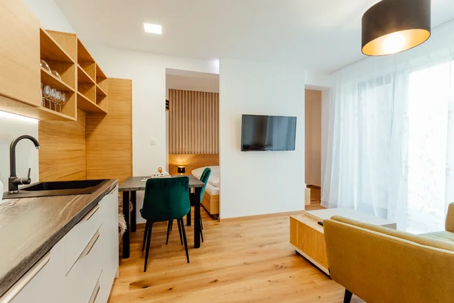 Ubytujete s nově zařízeném luxusním apartmánu s výhledem na Tatry. Vybrat si můžete apartmán Babky (2 + 0) nebo apartmány Kriváň, Chopok, Baranec či Ďumbier (2 + 2). Každý je jedinečný nejen stylem, ale i moderním vybavením. Na co se můžete těšit? Každý apartmán nabídne pohodlná lůžka, koupelnu s toaletou a sprchou, televizi a plně vybavenou kuchyňku, samozřejmostí je Wi‑Fi.