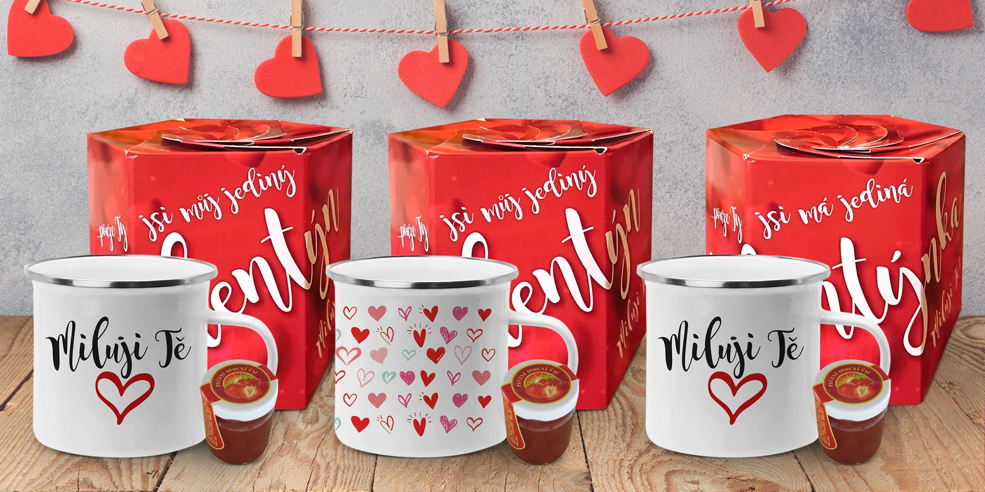 Valentýnské hrnečky a plecháčky s pečeným čajem a láskyplnými nápisy