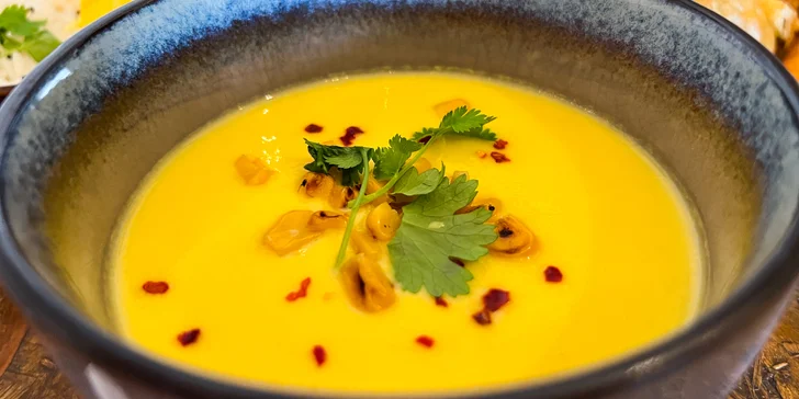 - 2× polévka: kukuřičný krém s chilli a kokosovými chipsy