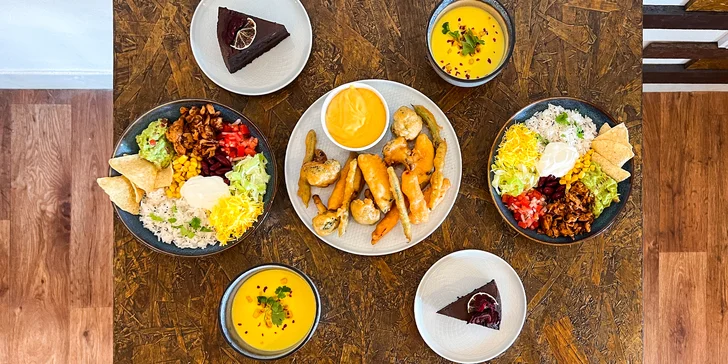 - 2× hlavní jídlo: burrito bowl (rýže, fazole, ledový salát, guacamole, rajčatová salsa, kukuřice, veganské trhané, zakysaná „smetana“, „sýr“)