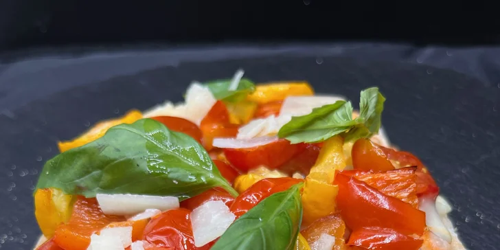 - Carpaccio (hovězí carpaccio, rukola, grana padano, balsamico, olivový olej, sušená rajčata)