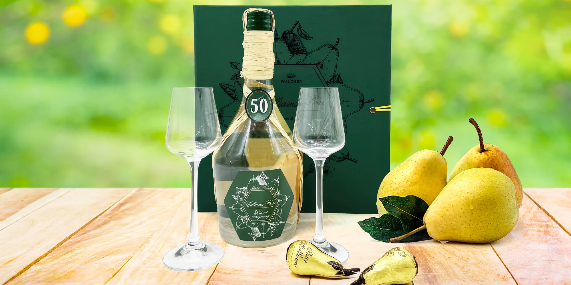 Láhev je zabalená do dárkové krabice v designu knihy a láhvi uvnitř dělají společnost i dvě čokoládové hrušky plněné hruškovicovým likérem a dvě degustační sklenky na stopce. Sáhnout můžete i po variantě se skleničkami, které na sobě mají vypískované číslo 30–80 (dle varianty), a parádně tak poslouží ke kulatým narozeninám obdarovaného. Tak na zdraví!