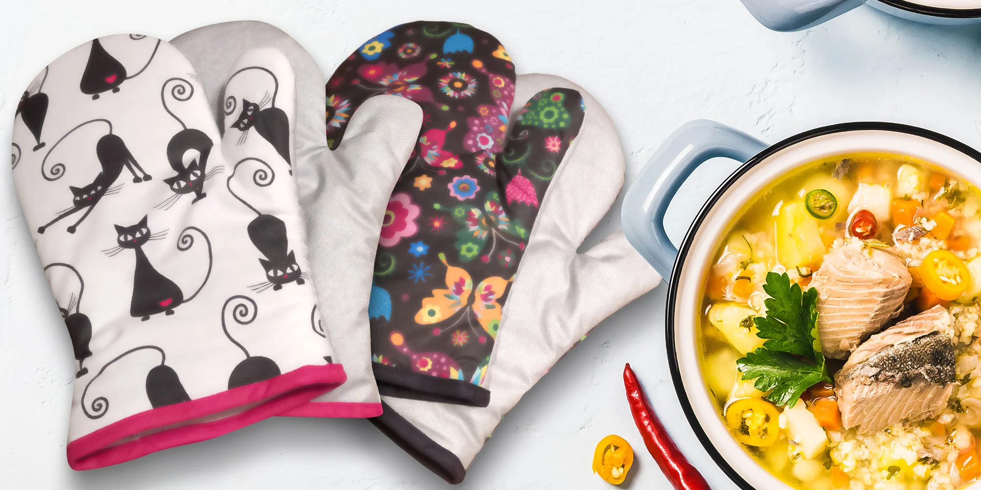 Pozor, pálí! Na to je potřeba pamatovat, jakmile otevřete troubu, nebo ve spěchu chňapnete po rozpáleném hrnci. Pro tyto situace je dobré mít po ruce chňapky, abyste nepřišli k nějaké zdravotní úhoně. A když ještě ke všemu budou mít nějaký veselý motiv, třeba kočky, sovy, motýli, včelky či prasátka a nebo třeba třešně, citron, pečivo či pivo, bude se vám vařit a péct ještě o něco líp!