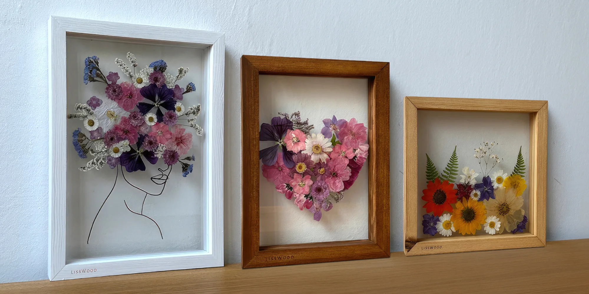 Obrazy LissWood vytváří ručně od sběru květin a rostlin po jejich napouštění, lisování, lakování přes výrobu a olejování rámečku až do následné výsledné podoby. Materiál je kvalitní, bez jakéhokoli plastu, pouze rostlina, sklo a dřevo.