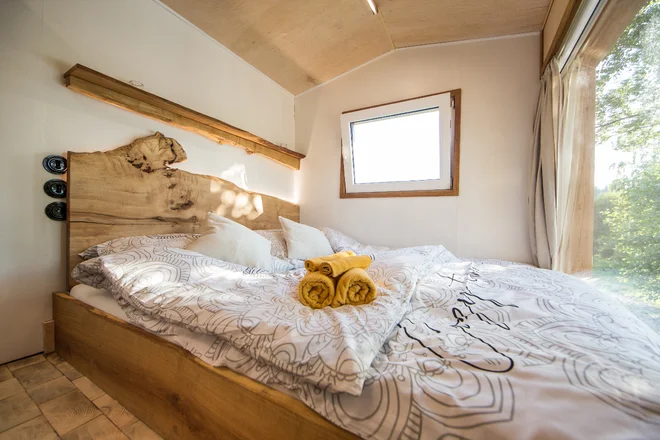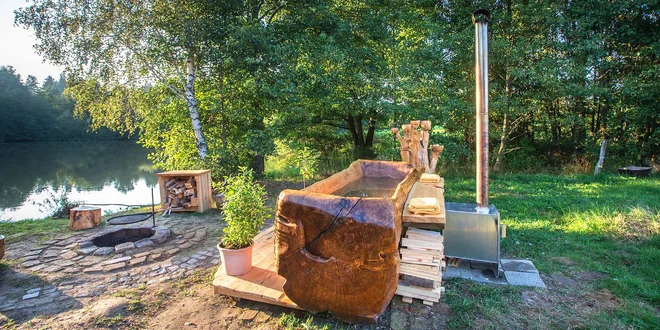 Hygienu zajistí koupelna se sprchou a chemickým WC. A pokud zatoužíte po dokonalém odpočinku, zalezte si do venkovní vany stvořené z kmene jasanu. Dlouhotrvající teplo vody zajistí kamna a pravidelné přikládání polínek. Během koupele si pak užijete krásný výhled na rybník.