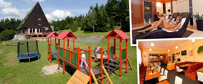 Odpolední kávu si vychutnejte na letní terase s výhledem na majestátní přírodu i své ratolesti skotačící na dětském hřišti s prolézačkami, houpačkami a trampolínou.