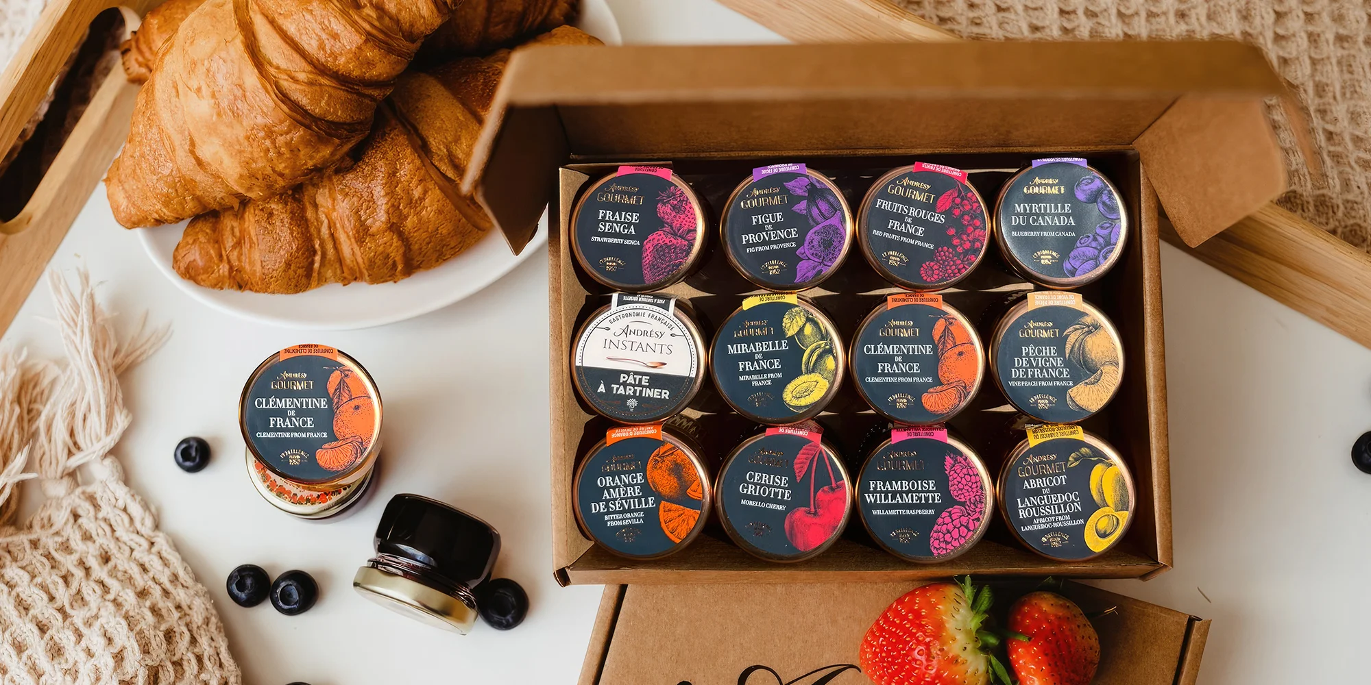 5 či 12 francouzských minidžemů v dárkovém balení: fík, třešeň, broskev aj.